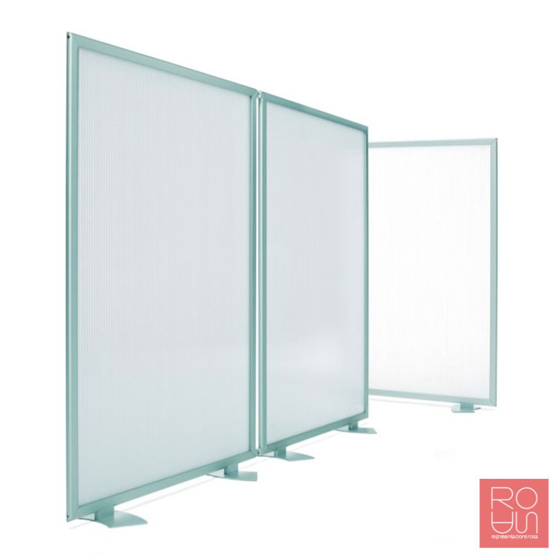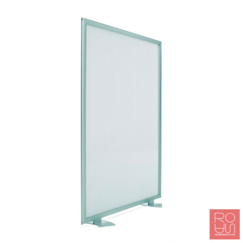 Material: Estructura fabricada en alumini anoditzat en plata mat i peus de fosa d'alumini amb rodes i fre. El panell és de policarbonat acanalat translúcid o transparent.