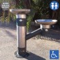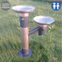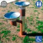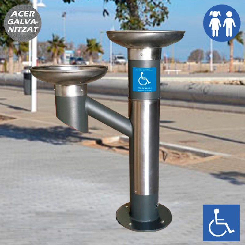 La font per beure adaptada FH-02 garanteix durabilitat, estètica i funcionalitat. Està fabricada combinant l'acer galvanitzat en calent termolacat (color a triar segona carta Ral) amb acer inoxidable AISI 304 (piques, adorn central i cargols).