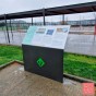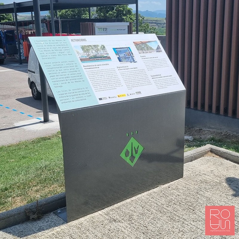 Placa Gràfica d'Alta Qualitat: Realitzada amb panell sandvitx d'alumini (Dibond) de 3 mm de gruix (mida 1200x400 mm), perfectament encolada a l'estructura d'acer. La retolació es fa amb impressió directa i un vernís de protecció antigrafiti i anti-UVA, assegurant la màxima llegibilitat i durada dels gràfics.