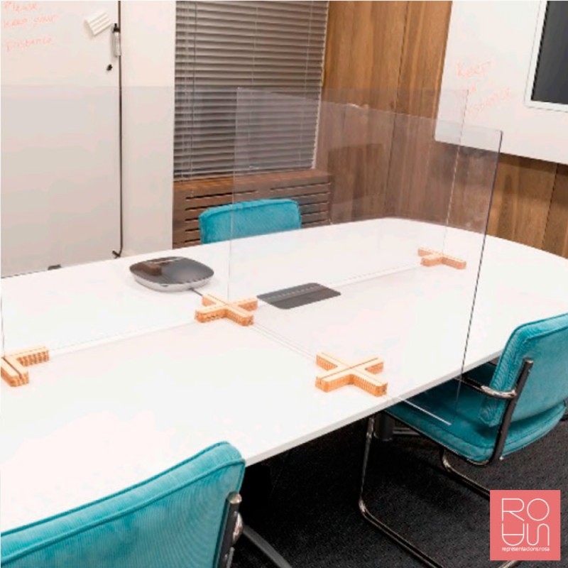 Suports de fusta per a mampares divisores de plexi (mampara no inclosa), per a disposició modular sobre taula. Gràcies a les seves diferents formes permeten fer nombroses combinacions entre elles.
