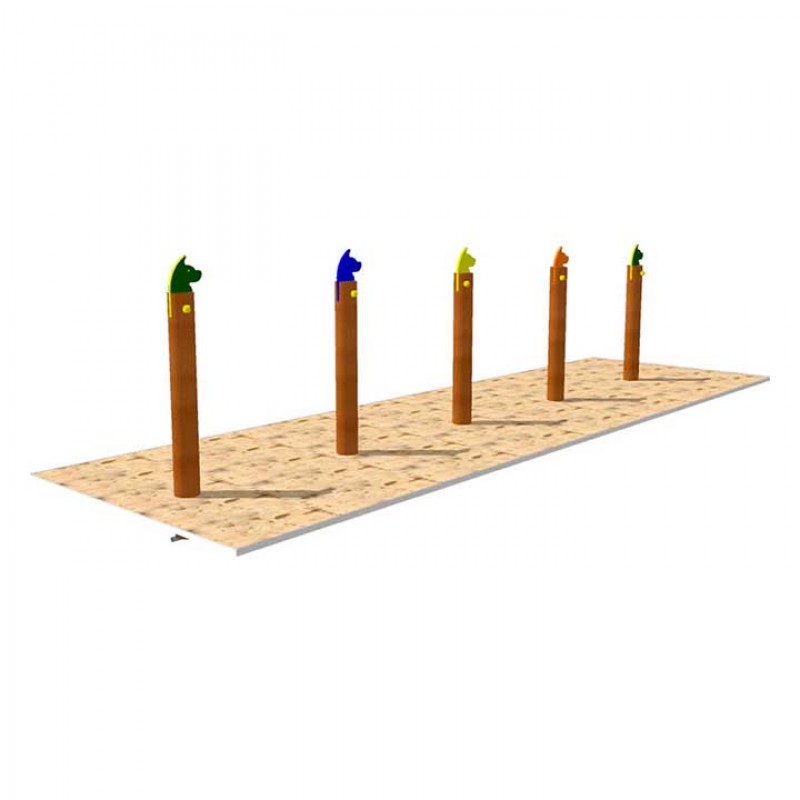 Estructura amb pals de fusta de 90 mm tractats i acabats amb lasur. Panells de polietilè d'alta densitat de 16 mm i cargols M8 x 30, 90,110 i 120. Cubretornillos de color groc. Barra de diàmetre 28 d'acer pintada al forn.